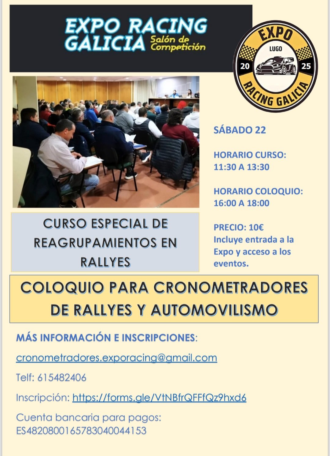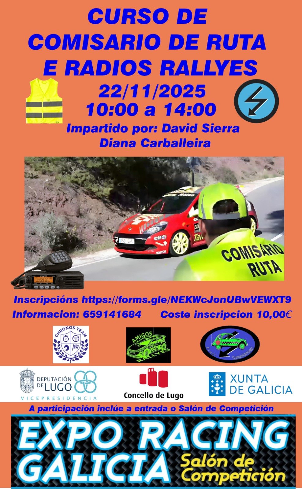 Nos especializamos en la organización del Salón de Competición de Galicia – Exporacing Galicia, formación de oficiales de Motorsport, y en la colaboración y organización de competiciones de motor como rallyes, subidas de montaña, slalom, rallymix y rallysprint.